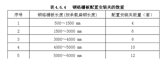 4.6.4 對(duì)于有拆卸要求的鋼格柵板一般采用安裝夾安裝。按照?qǐng)D紙或廠家技術(shù)文件要求,將鋼格柵板用安裝夾緊固在支承粱上,原則上每塊鋼格柵板的安裝(約1平方米計(jì))不少于四套安裝夾,分別安裝在鋼格柵板的四個(gè)角上。但如果鋼格柵板較長(zhǎng),且板中間有支承梁的情況下,安裝夾可按表4.6.4鋼格柵板配置安裝夾的數(shù)量配置